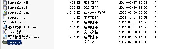 二、然后删除update.exe  iistool.dat 文件,改名“建站助手V4.0.exe”为“建站助手V4.0.exe.bak”;“iistool4.mdb”改名为“iistool4.mdb.bak”;“iistool.old”改名为“iistool.dat”,直接运行网站管理助手V3.exe即可使用,请注意如已在4版本新建立过站点、数据库、ftp等信息无法导入管理!